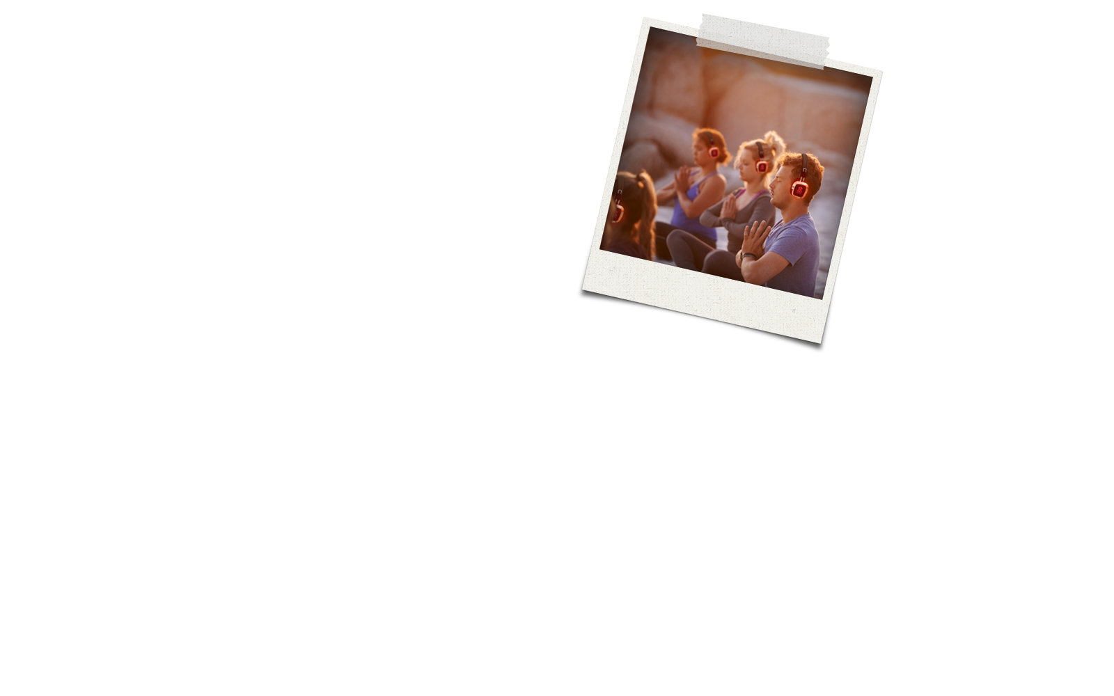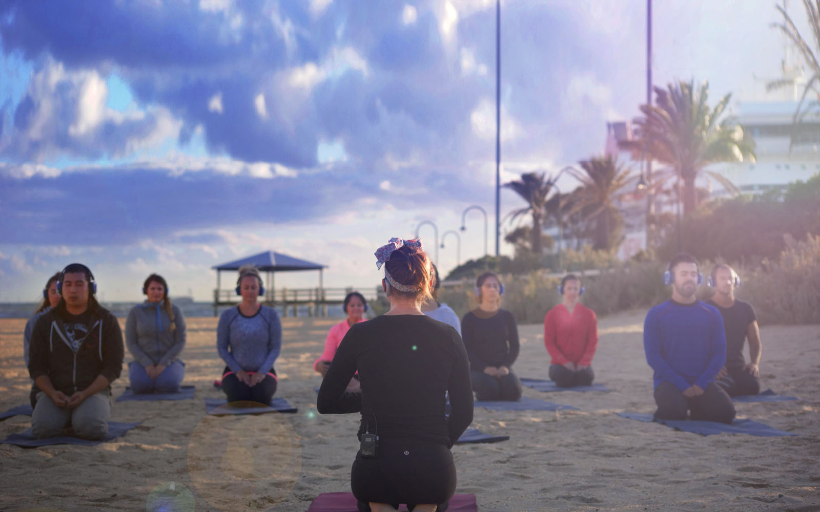 Silent Yoga creates unforgettable experiences using our specially designed, and very comfortable wireless headphones that allows each attendee to control their own volume and tune in on up to three audio channels from your instructor and their selected music soundtrack. Because only those with headphones can hear, your chosen audience is completely immersed in the experience regardless of whether it’s a yoga class in a noisy gym or yoga on the beach.